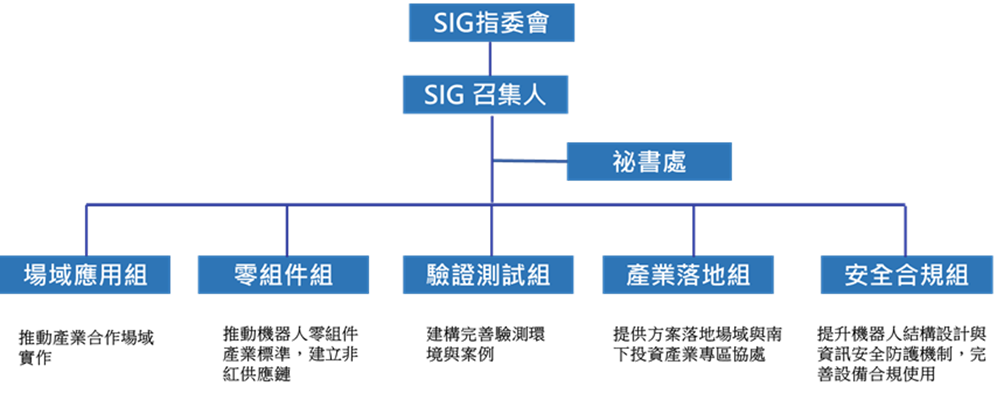 SIG匯集了產業、新創、學界與政府的力量,形成一個跨界合作交流平台,標竿全球前瞻趨勢與國際案例,掌握技術發展趨勢、推動商業驗證、拓展市場機會、吸引投資合作,健全臺灣智慧機器人產業生態系。